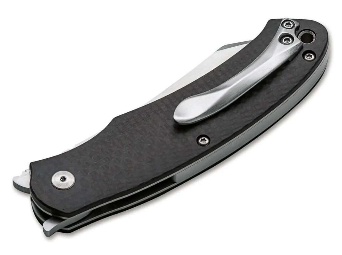 The D2 Blade Has A Fine Lengthwise Satinized Finish With Decorative Filework On The Spine That Also Serves As A Thumb Rest. It Rests On Ball Bearings And Opens With The Front Flipper That Is Typical For The Japanese Knifemaker’S Designs. The Blade Is Secured With A Sturdy Linerlock. The Slightly Contoured Handle Scales Are Made From Carbon Fiber Mounted On Solid Stainless Liners. The Full-Length Spacer Also Consists Of Stainless Steel, Creating An Elegant Contrast To The Dark Scales. A Black Leather Lanyard And 3D Cnc-Milled Clip Complete The Design.
