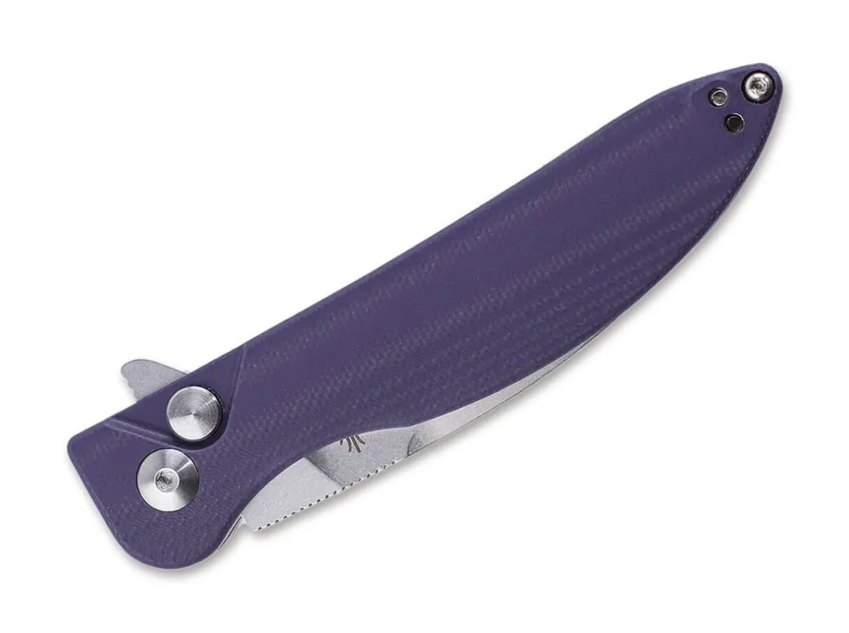 The Practical Edc Masters Everyday Tasks With The Robust Wharncliffe Blade Made Of N690, Which Is Opened With A Flipper. The Button Lock Allows The Blade To Swing Back Safely Into The Purple G10 Handle. With A Convertible Clip (Tip-Up/L+R).