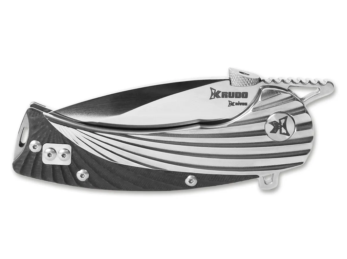 The Spectacular Design Of The Revised Version Of The Krudo Discipline Folder With Its Carbon Fibre Scales Cannot Hide The Fact That This Is A Very Versatile And Potent Cutting Tool. The Pocket Knife Was Strictly Designed According To Krudo’S Maxim Of Maximum Practicality. The Blade Runs On Ceramic Ball Bearings And Opens By Thumb Stud (Which Also Acts As An Opening Hook On The Pocket Hem) And By Front Or Standard Flipper. The Large Clanyard Hole Forms The Grip Closure. Convertible Clip (Tipup/ L-R).