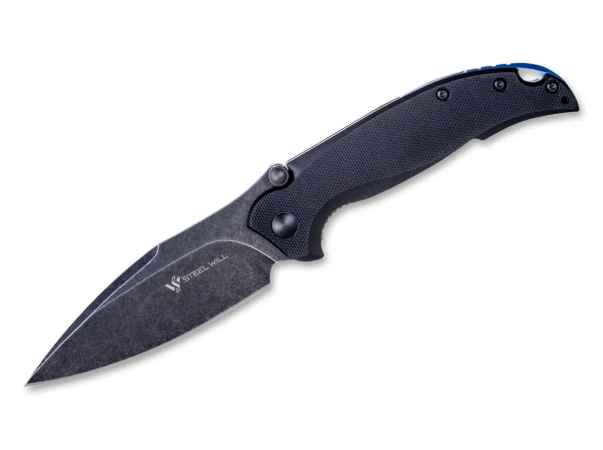 The Progressive Steel Will Scylla F79-07 Convinces With A Ball-Bearing Blade Made Of D2 In A Black Stonewash Finish, Which Opens With A Thumb Stud And Locks Securely With The Linerlock. The Non-Slip Handle Made Of Black G10 And The Blue Aluminium Spacer Provide A Noble Mix Of Materials In An Elegant Look. With A Clip (Tip-Up /R) And A Lanyard Hole.