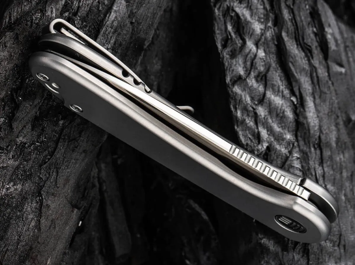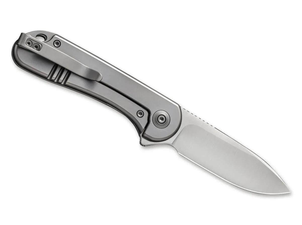 Das Elementum Von We Knife Ist Die Reinform Eines Edlen Framelock Folders. Die Pulvermetallurgische Cpm-20Cv Klinge Und Der Silberne Titangriff Bilden Eine Unzertrennliche Einheit, Die Nur Bei Betatigen Der Flipper-Offnung Und Des Stabilen Framelocks Ihren Aggregatszustand Andert. Doch Aufgepasst: Das Elegante Messer MitClip (Tip-Up/R) Lost Eine Ungeahnte Reaktion Der Begierde Beim Betrachter Aus.