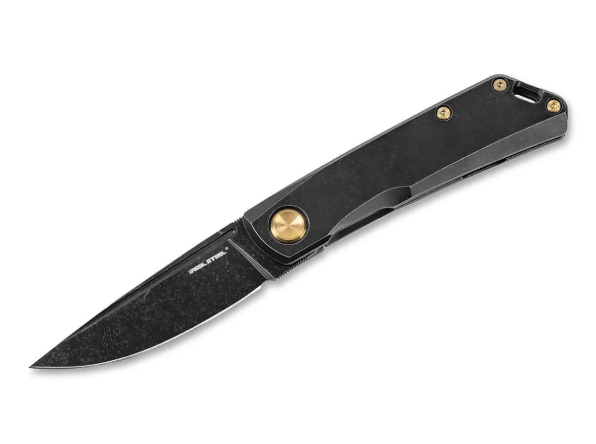The Bigger Brother Of The Real Steel Luna Eco Is An Elegant Edc Knife, Which Is Completely Black. The Frame Lock Folder With N690 Blade Opens Optionally By Nail Cut Or Removable Thumb Pin, While The Titanium Handle Offers Flexible Transport Options Through The Deep Carry Clip (Tip-Up/R) And The Lanyard Loop. Optical Highlights Are The Gold-Colored Screws And The Thumb Pin.