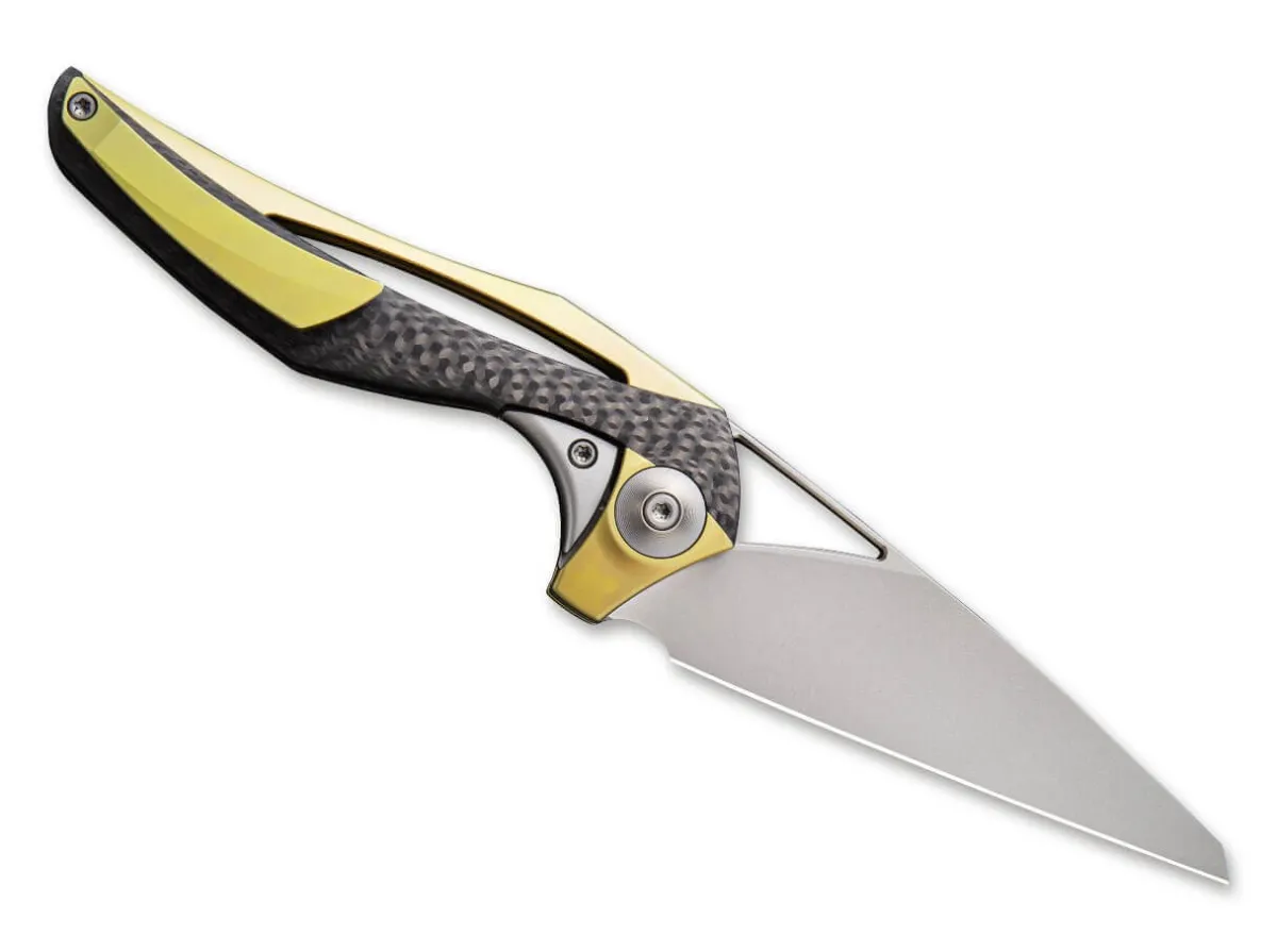 The We Knife Aeterna Gold Is An Elegant Pocket Knife Designed By Famous Knifemaker And Designer Elijah Isham. His Designs Are Often Characterized By Organic Shapes And Wavy Lines And This Holds True For This Knife. The Handle Made From One Piece Of Titanium Is Paired With Carbon Fiber Handle Scales. Both These High-Quality Materials Blend Beautifully, Creating An Interesting Visual Effect. The Aeterna Opens Easily With The Help Of The Generous Thumb Opening. When Open, The Blade Is Held In Place By A Framelock. The High-Quality Wharncliffe Blade Is Made From M390 And Is Designed To Last Forever. A Subtle Pocket Clip (Tip/Up) Completes The Picture.