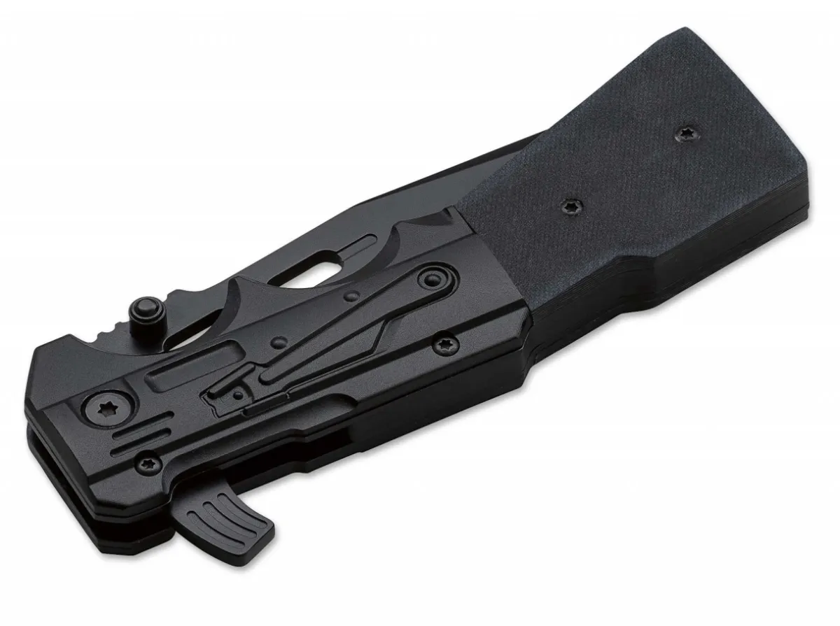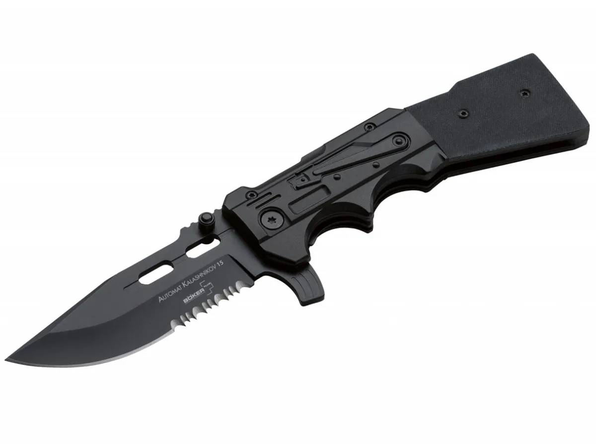 The Boker Plus Kal-15 Presents Itself As A New Highlight From The Kalashnikov Series. The Grip Is Based On The Shape Of The Piston And Housing Of The Original, While The Flipper To Quickly Deploy The Blade Reflects The Shape Of The Magazine. Two Deep Finger Grooves And The Thumb Groove Together With The Receding Handle Line In The Back Region Ensure An Extremely Secure Grip. The Blackened Blade Is Engaged By A Linerlock, While The Razor Sharp Partial Serration Cuts Fibrous Materials With Ease.
