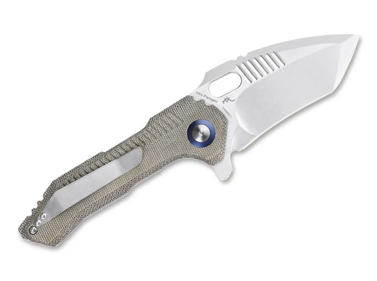 The Kizer Mini Paragon Impresses Above All With Its Beefy Appearance. The Wide Tanto Blade Of 154Cm, The Large Thumb Hole, The Gill-Like Recesses – This Knife Just Wants To Cut And Takes On All Work, Whether In Outdoor, Camping Or Everyday Life. The Molded Green Micarta Handle Fits Securely In Your Hand And Houses The Sturdy Liner Lock. Particularly Noteworthy Here Is The Blue Anodized Blade Axle Screw, Which Is The Optical Output Center Of The Knife. With Clip (Tip-Up/R).