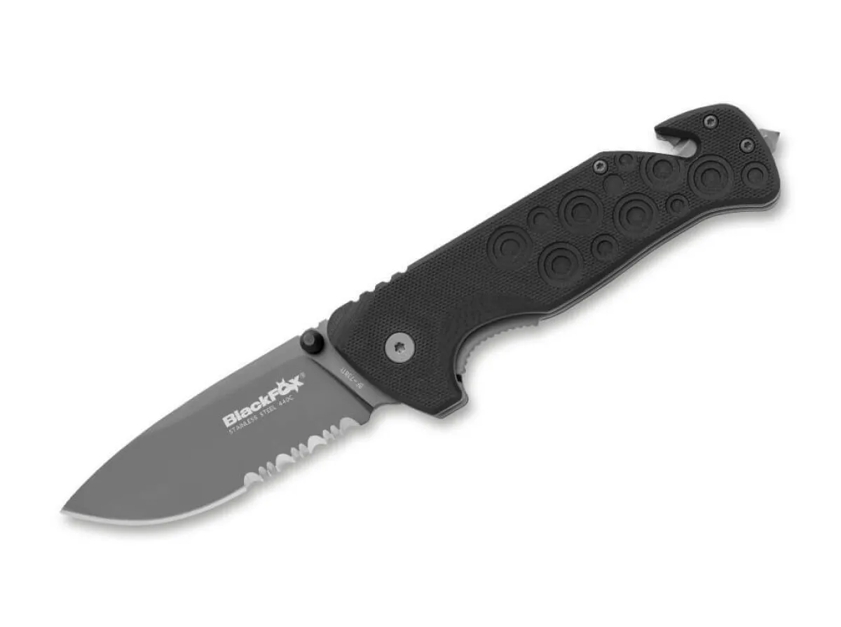 The Blackfox Black Action Is A First Class Rescue Knife. Glass Breakers And Belt Cutters, Structured G10 Shells And A Universal Half-Serrated Droppoint Blade Leave No Requirement Unfulfilled. The 440C Stainless Steel Blade Locks With A Reliable Liner Lock. The Tactical Version Is Equipped With A Titanium–Aluminium Nitride-Coated Blade And Black G10 Handle Scales.