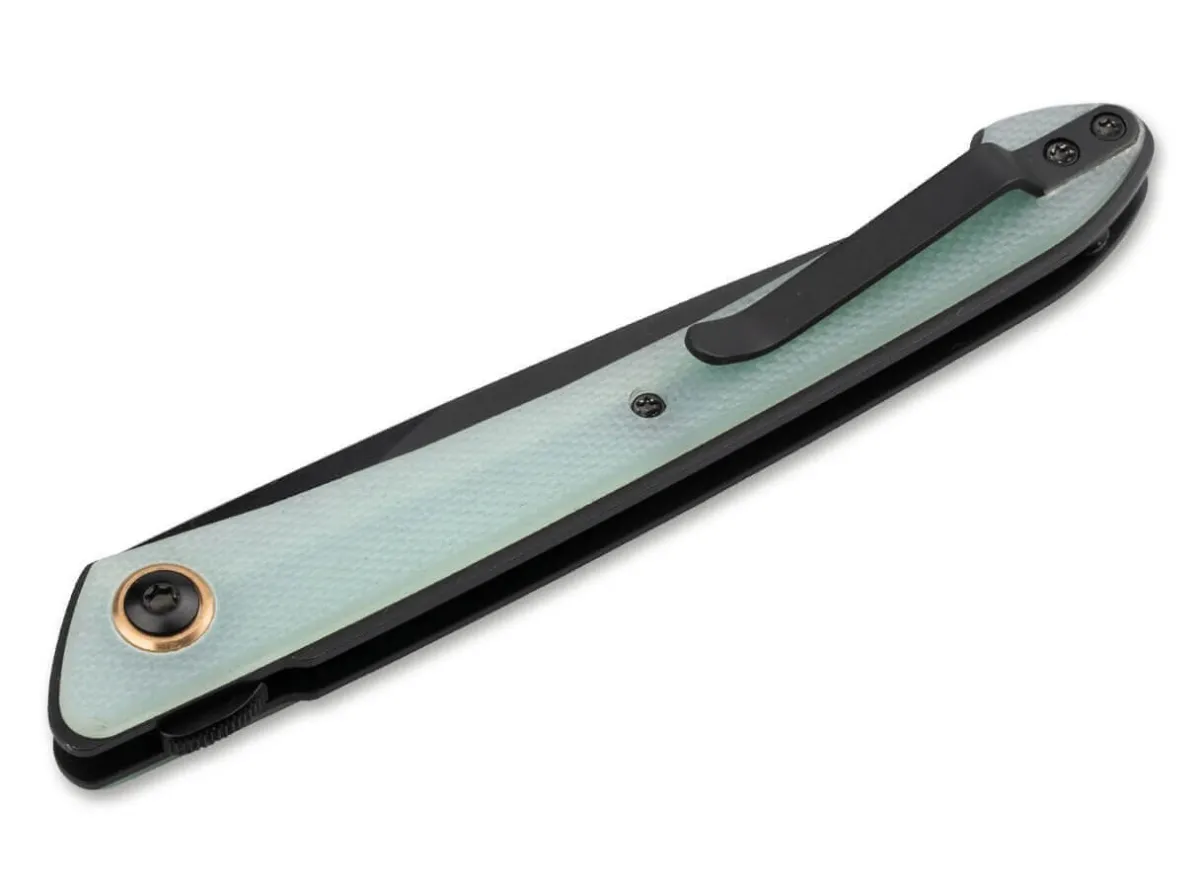 The Slim Boker Plus Urban Spillo Is An Extremely Compact Pocket Knife For Everyday Use That Can Be Carried Comfortably And Is Hardly Bulky. The Ball-Bearing Spearpoint Blade Made Of 440C With A Black Coating Is Operated With The Help Of The Discreet Front Flipper. A Sturdy Linerlock Reliably Locks The Blade After Opening. The Pocket Knife Has Handle Scales Made Of Natural Jade G10, The Semi-Transparent Original Variant Of The Resistant Composite Material. The Handle Body Is Held Together By Black Screws, While A Brass-Coloured Ring Around The Blade Axle Screw Adds A Visual Accent. Supplied With A Practical Clip (Tip-Up/R).