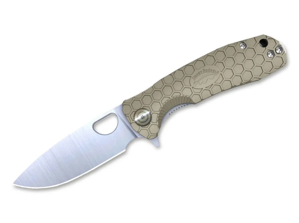 What Is Particularly Impressive About The Honey Badger Flipper Medium Is Its Durable Construction. The 8Cr13Mov Drop Point Blade Is Extremely Robust And Easy To Sharpen. The Thick Shaft And Wide Profile With Full Flat Grind Provides Stability And Makes Cutting Easy. The High-Quality Ball Bearing Pivot Enables Smooth Opening And Closing Of The Satin-Finish Blade, Either With The Flipper Or Thumb Opening. The Honeycomb Pattern On The Textured, Tan Frn Handle Scales Ensures A Secure Grip. With Lanyard Hole And Reversible Deep-Carry Clip (Tip-Up/L-R).