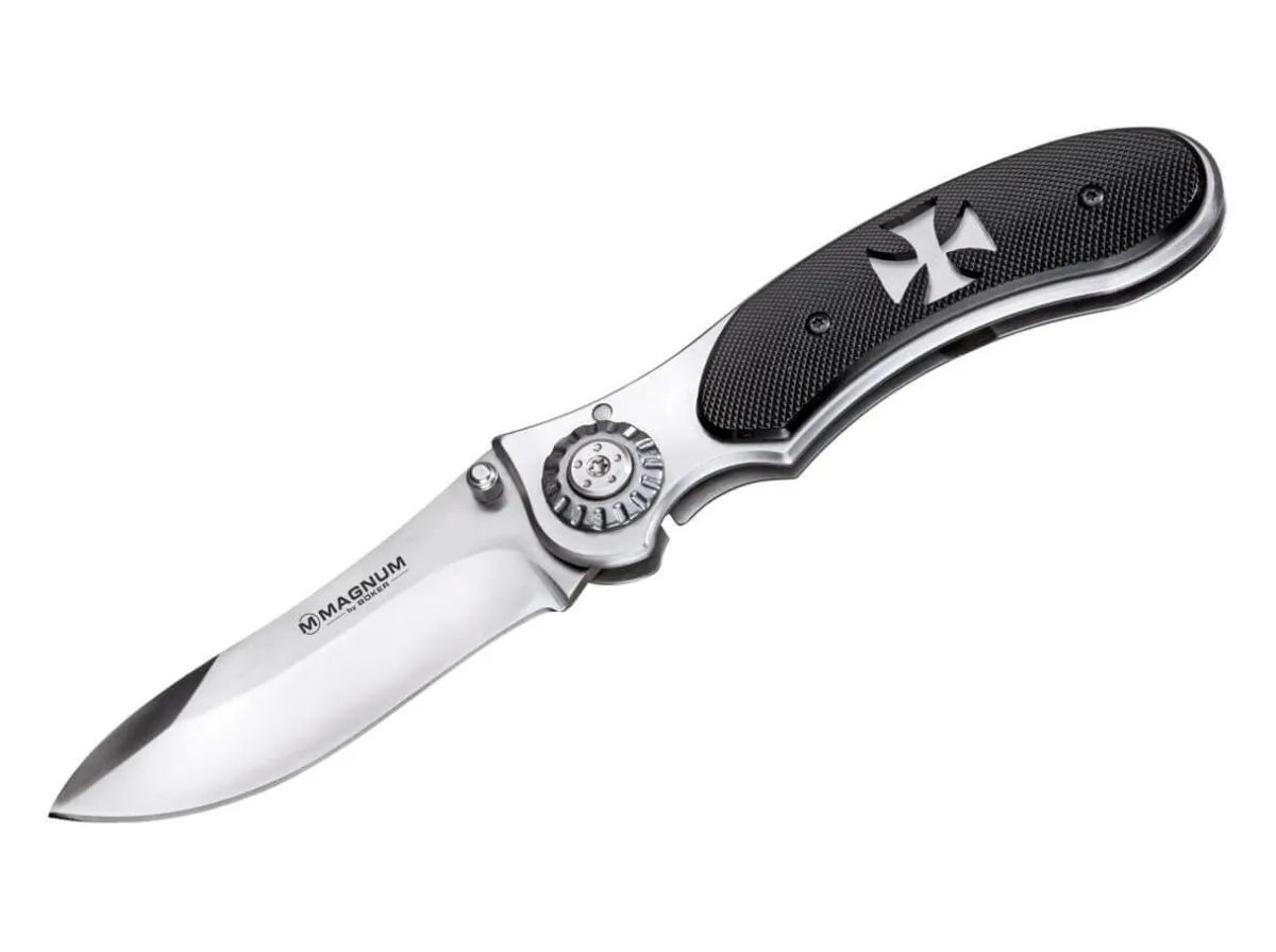 The Spring Assisted Magnum Iron Cross Features A Slightly Bellied Blade Made From Satin-Finished 440A Steel With A Hollow-Ground For The Best Cutting Results. The Black Synthetic Grip Scales Have A Pocket In The Shape Of A Cross And Provide An Unrestricted View Of The Satin-Finished Stainless Steel Liner.