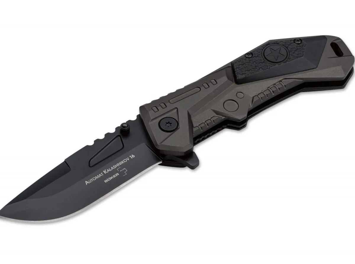 The Kal-16 Is Configured As A Massive Utility And Tactical Knife That Is Suited For A Wide Range Of Tasks With Its Wide Blade And The Generously Proportioned Thumb Ramp. The Liner Lock Knife Is Opened By Thumb Stud Or Flipper, Where The Latter Also Acts As A Hand Guard For Heavier Chores, Thus Increasing Operating Safety. Solid Steel Liners And Ergonomic Aluminum Scales In The Two-Tone Kalashnikov Design. Without Clip. Blade Steel 7Cr17. Shipped With Kalashnikov Belt Pouch Made From Reinforced Nylon.