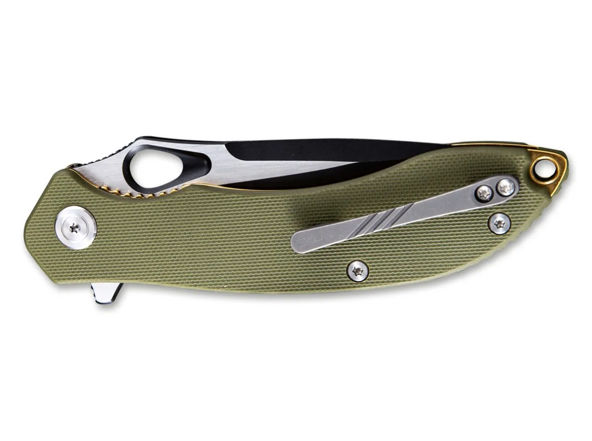 The Aquila Is A High-Quality Linerlock Pocket Knife From We Knife, Who Present A New Line With Civivi, Which Is Distinguished Above All By The Excellent Price-Performance Ratio. Gold-Coloured Tempered Stainless Steel Plates With G10 Scales. Ball Bearing, Partly Coated Blade Made Of Vg-10 With Satin Finish. With Clip (Tip-Up).