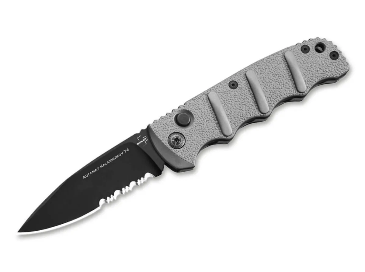 The Boker Plus Kals-74 From The Kalashnikov Series Is Certainly One Of The Most Popular Models In Our Range And Has Been Produced In Numerous Different Variants In Recent Years. The Aluminium Handle Is Reminiscent Of The Bayonet Of The Famous Assault Rifle And The Raised Structural Tracks Offer A Secure Grip In Any Situation. The Black Coated, Partially Serrated Blade Is Made Of Aus-8 Stainless Steel And Can Be Secured With A Slide Lock In Addition To The Push Button. With Clip (Tip-Up).