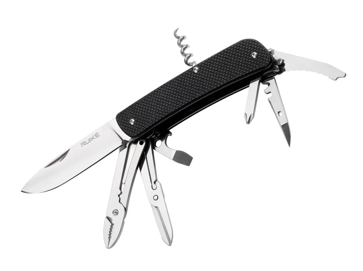 The Large Blade And Robust Tools Make The Ruike L Series Suitable For All Kinds Of Outdoor Activities And Emergency Use. The 8.5 Cm Long Polished Blade Made From Sandvik 12C27 Stainless Steel Has Enhanced Thickness And Width For Longer Life And More Versatile Use. The Textured, Black G10 Handle Sits Comfortably In The Hand For A Secure Grip And Is Ideal For Long-Term Use. It Also Has A Corkscrew, Can Opener, Screwdriver, Scraper, Bottle Opener, Wire Cutter, Wire Stripper, Small Screwdriver, Cutting Hook, Phillips Screwdriver, Wire Bender, Tweezers, Scissors, Pliers, Awl, And Saw. The Tungsten Steel Glass Breaker Enables The User To Break Glass Or Other Tough Materials. The Knife Opens With A Nail Nick And Is Secured With The Help Of A Slipjoint. With Loop, Key Ring And Tip-Down Clip.