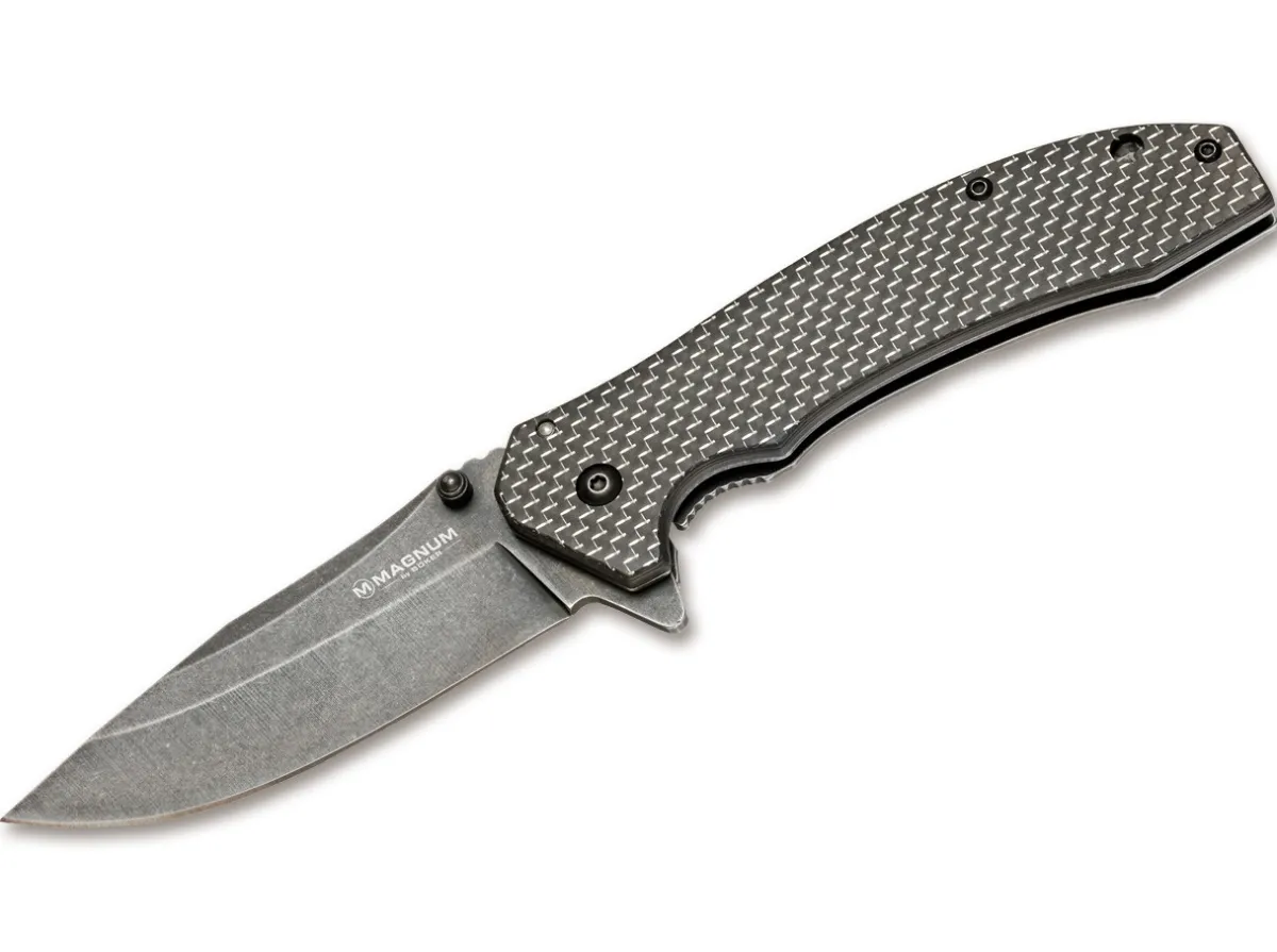 The Magnum Aircraft Engineer Has A Handle Of Wired Carbon Fiber, A Material Used In Aircraft Construction. The Blade Of 440A Steel Can Be Opened With The Flipper Or Thumbstud And Is Secured With A Framelock. The Clip Is A Practical Addition To This Flat Knife.