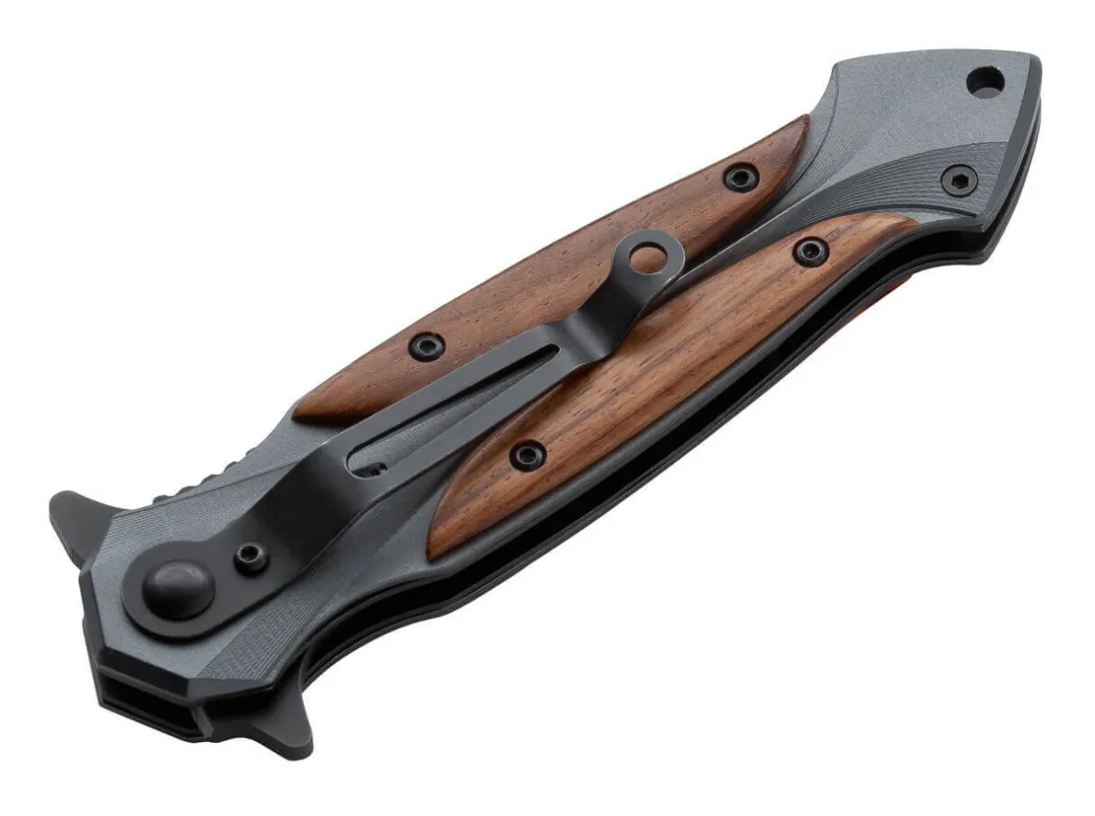 The Magnum Starfighter Is A Futuristic Appealing, Modern Pocketknife. The Spring-Assisted Blade Can Be Opened With One Hand And Is Secured By A Linerlock. It Is Made Of 440A And Is Dagger-Like Sharped, But Ground On One Side. The Spindle-Shaped Handle Provides Secure Grip And The Shape Reminds Of Historical Swords, Not Least Because Of The Applied Cocobolo Wood. Includes Pocket Clip And Lanyard Hole. It Has An Exceptionally High Oil Content Which Gives The Wood An Intense Floral Scent. Cocobolo Also Owes Its Good Resistance To Moisture To This. Includes Pocket Clip And Lanyard Hole.