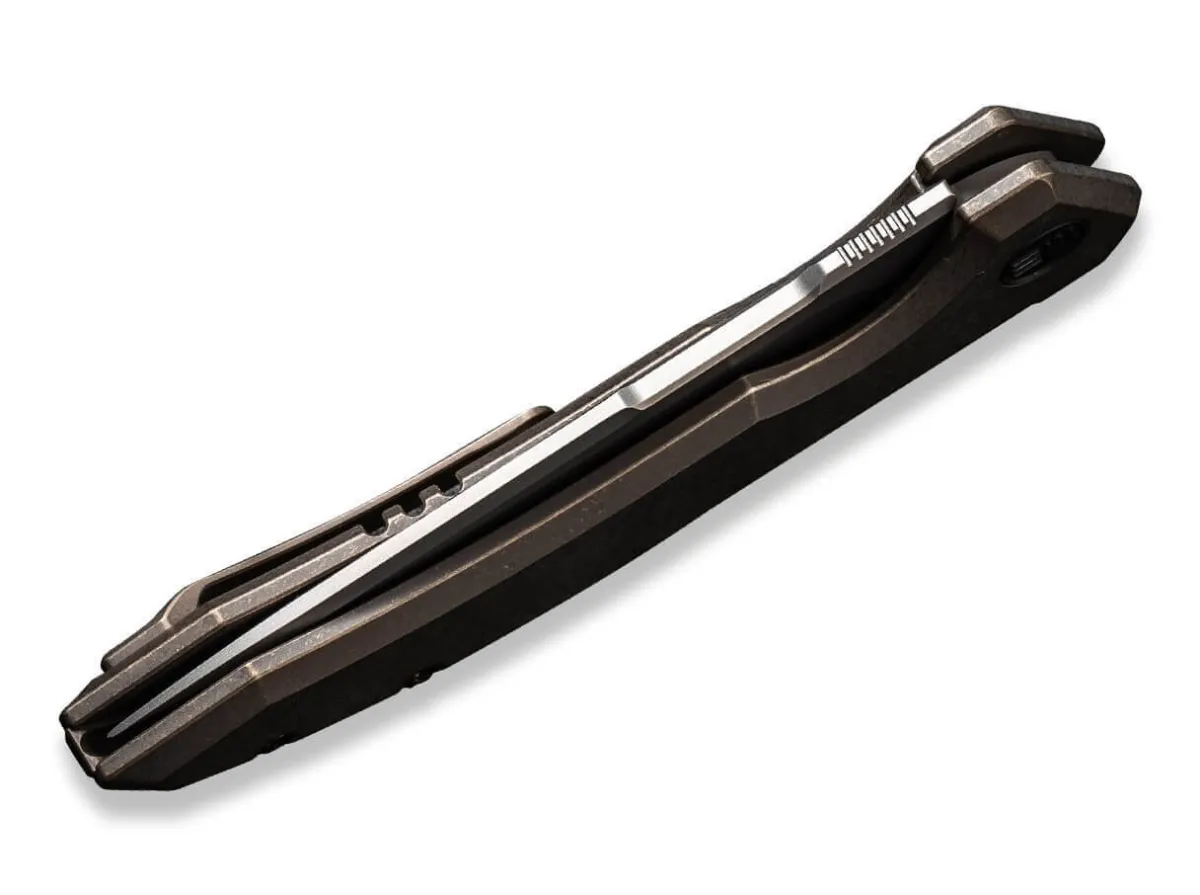 The We Knife Quixotic Is The Idealist Among Edc Knives. As Proof, The Framelock Folder Cites The Powder-Metallurgical Blade Made Of Cpm-20Cv And The Bronze-Colored Handle Made Of Titanium, Which Make Everyday Cutting Tasks A Breeze. The Distinctive Ricasso And The Grooves On The Back Of The Blade Set Visual Accents, While The Clip (Tip-Up/R) And The Lanyard Loop Round Off The Knife Functionally.