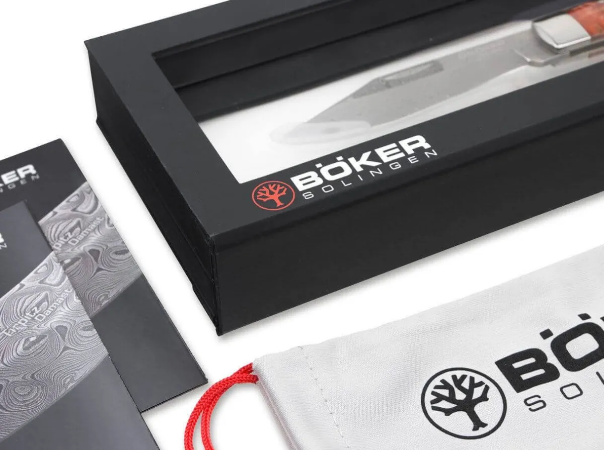 The Blanks Are Classically Made Of Brass, While The Bolsters Are Made Of Nickel Silver. The Blade Made Of Hand-Forged Stainless Damascus By Chad Nichols From Mississippi In The Usa Convinces With 200 Layers And The Pattern Scrambled. It Locks Securely With A Backlock And Harmonizes Beautifully With The Finely Grained Burl Birch Scales, Stained In The Noble Shade Of Amboina Red. Handcrafted In The Boker Manufactory In Solingen And Strictly Limited To 999 Knives Worldwide. Delivered With The Reissued Historical Boker Tree Emblem, Certificate And Noble Floating Display.
