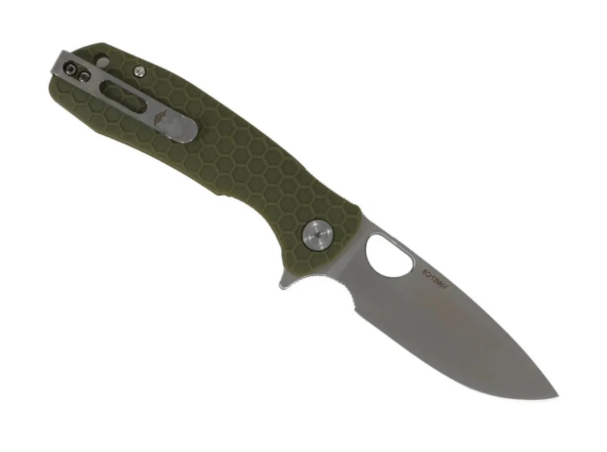 Der Honey Badger Flipper Small Uberzeugt Insbesondere Mit Seiner Widerstandsfahigen Konstruktion. Die Droppoint-Klinge Aus 8Cr13Mov Ist Uberaus Robust Und Leicht Zu Scharfen. Der Dicke Schaft Und Das Breite Profil Mit Vollem Flachschliff Sorgen Fur Stabilitat Und Einfaches Schneiden. Das Hochwertige Kugellager Ermoglicht Das Reibungslose Offnen Und Schliesen Der Satinierten Klinge, Die Per Flipper Oder Daumenoffnung Geoffnet Werden Kann. Das Honigwaben-Muster Der Texturierten, Olivgrunen Griffschalen Aus Frn Sorgt Fur Eine Sichere Handlage. Mit Fangriemenose Und Umsetzbarem Deep-Carry-Clip (Tip-Up/L-R).