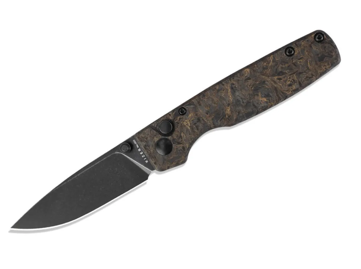 The Original Kizer Is Light, Strong, Sharp, And Easy To Maintain. In Addition, The Edc Folder Also Looks Extremely Elegant – An Original Kizer. The Blade Is Made Of Powder Metallurgy Cpm-20Cv With A Black Coating And Opens With A Thumb Stud. Incomparable Is The Handle Made Of Yellow-Black Fat Carbon, Which Gives The Knife A Unique Look. The Discreet Button Lock Takes Care Of The Unlocking, While The Black Clip (Tip-Up/R) Allows For Deep Carry.