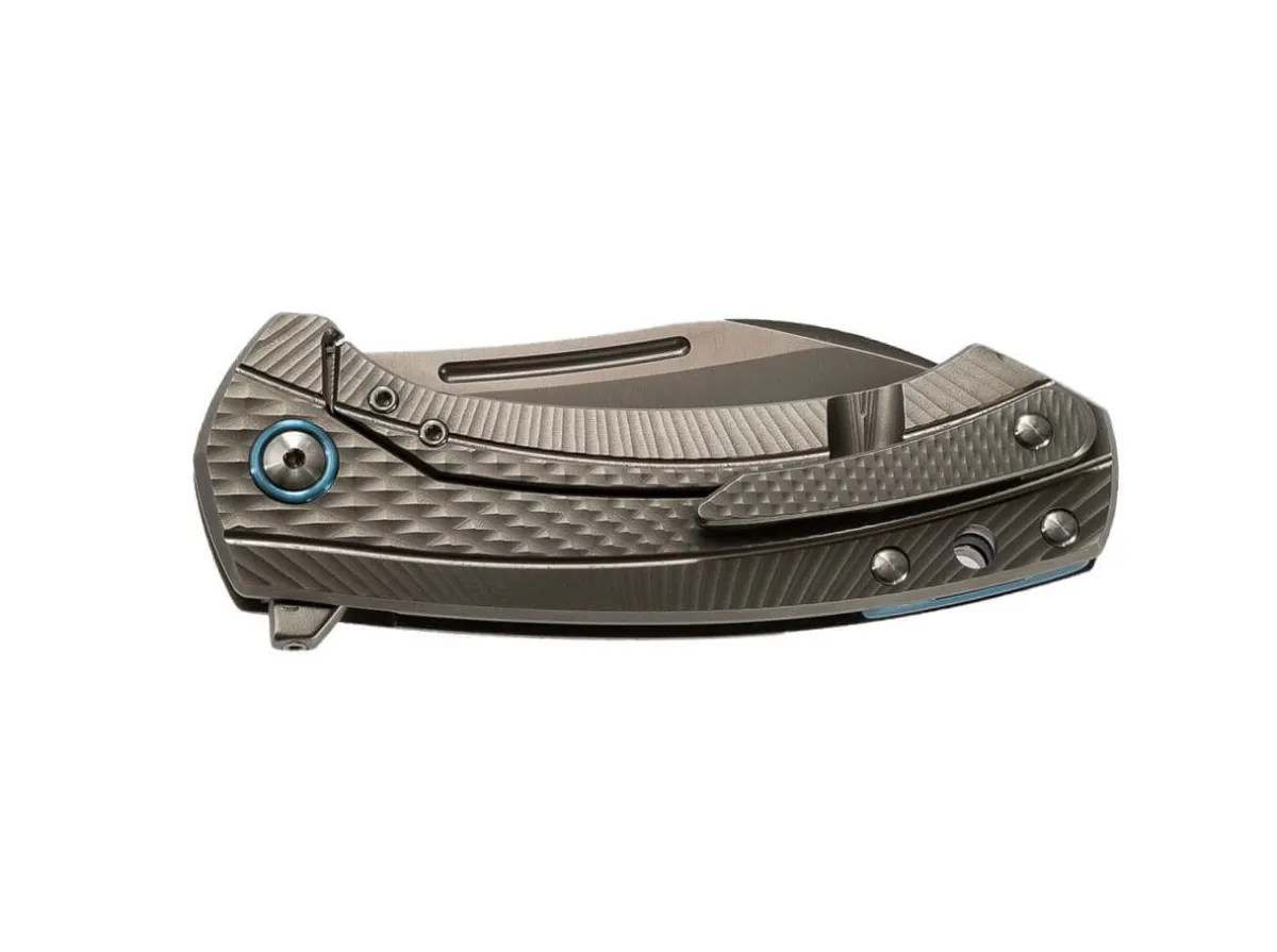 The Curved Titanium Handle Features The Characteristic Milled Design. The Blade On Ball Bearings Consists Of Bohler M390 And Is Easy To Open With The Removable Flipper Or The Striking Nail Nick. A Satinized Finish Completes The Blade Design. The Blade Is Secured By A Sturdy Framelock Made From Solid Titanium. The Spacer And Clip Consist Of The Same Material.
