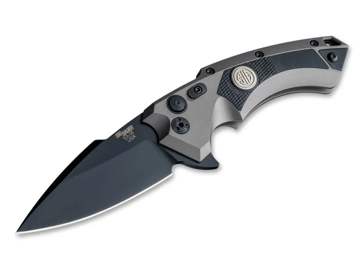 Der In Lizenz Von Hogue Fur Sig Sauer Gefertigte Ex-05 Folger Von Allen Elishewitz Ist Mit Einer Beschichteten Klinge Ausgestattet. Sie Wird Per Flipper Geoffnet, Besteht Aus Dem Pulvermetallurgischen Cpm-154 Und Verriegelt Per Druckknopf, Mit Zusatzlicher Schiebesicherung. Die Futuristische Formgebung Des Aluminiumgriffes Geht Mit Einer Perfekten Ergonomie Mit Hoher Griffsicherheit Einher. Die Beschalung Tragt Das Emblem Von Sig. Mit Umsetzbarem Deep-Carry-Clip (Tip-Up/L-R) Und Fangriemenose.
