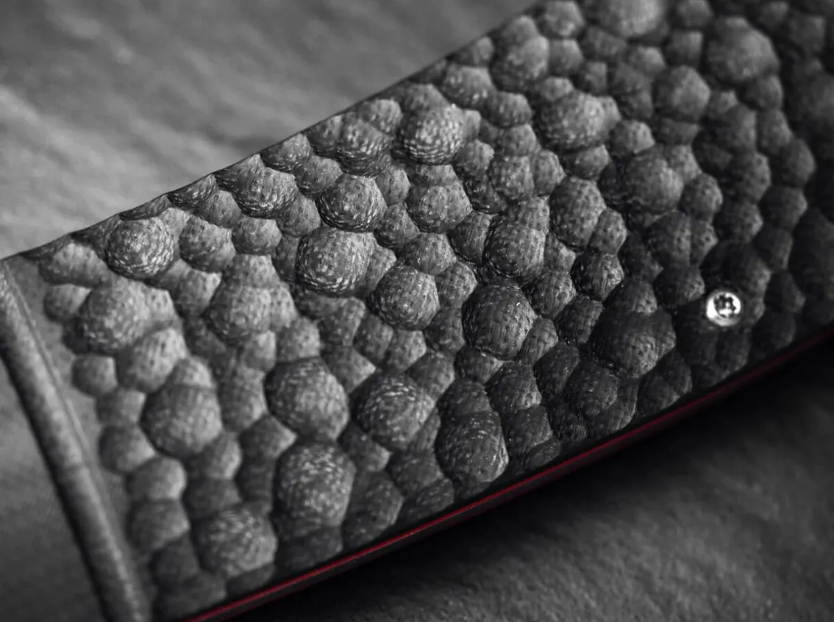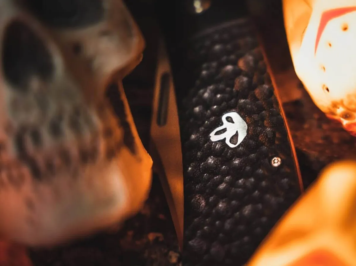The Wide Clippoint Blade Is Made Of D2 And Is Provided With An Impressive Hairline Finish And A Distinctive Ricasso. The Knife Is Opened By Nail Nick And Does Not Lock. The Exceptional G10 Handle Scales Have A Coarse Texturing Reminiscent Of A Rustic Forged Skin. Indicated Bolsters, Red Fibre Layers Of G10 And A Stylised Skull Emblem On The Front Underline The Provocative Character Of The Knife. Supplied With Lanyard Hole And High-Quality Nylon Sheath For Storage.
