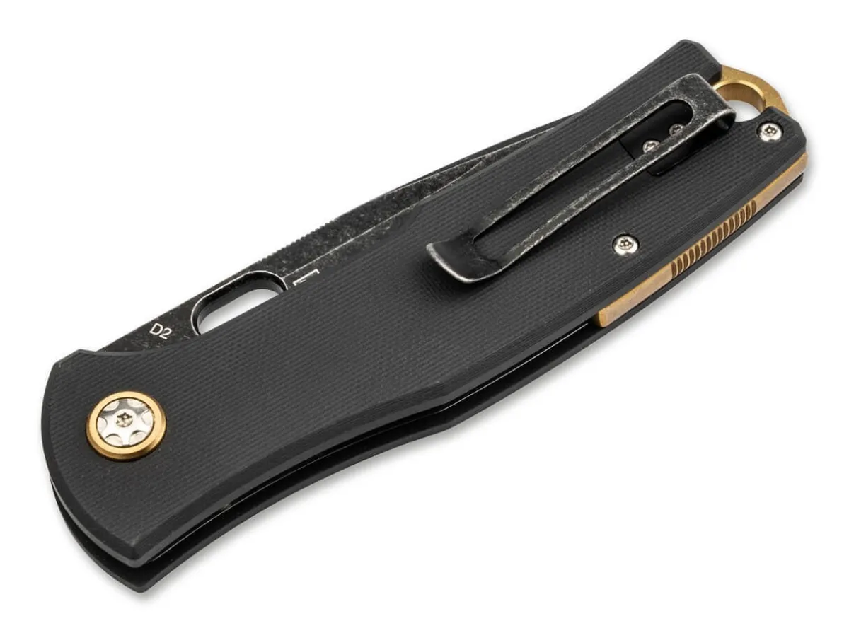 The Boker Plus Fieldfolder Designed By Jesper Voxnaes Masters All Cutting Tasks Effortlessly And Convinces In Everyday Life As Well As In Use. The Reliable Pocket Knife Is Supplied With A Dark Stonewash Blade Made Of D2, Which Is Operated By A Thumb Hole And Secured By A Sturdy Linerlock. The Liners Recessed Into The Impressive Textured Black G10 Handle Scales Are Made Of Stainless Steel, While The Partially Exposed Spacer Is Made Of Brass. A Likewise Brass-Coloured Ring Around The Decorative Pivot Screw Adds An Additional Visual Accent. Jimpings Around The Thumb Rest And At The End Of The Handle Increase Safety At Work. With Lanyard Hole, Deep-Carry Clip (Tip-Up/R) And High-Quality Nylon Pouch For Storage.