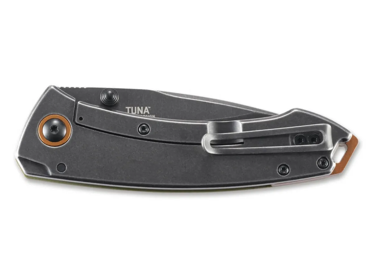 With A Profile And A Blade Shape Reminiscent Of A Predator Of The Deep Sea, The Crkt Tuna Masters All The Cutting Tasks Of Everyday Life With Ease.Designed By Lucas Burnely, The Pocketknife Is Equipped With An 8Cr14Mov Stonewash Blade, Which Opens With A Thumbstud And Is Secured By A Framelock.The Aluminum Handle Has A Front Scale Made Of Green G10.The Bronze-Colored Anodized Ring Around The Axial Screw Creates A Delightful Visual Accent And Matches The Exposed Lanyard Hole.With A Detachable Clip (Tip-Up).
