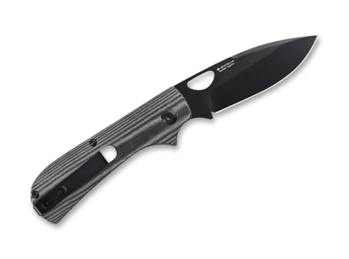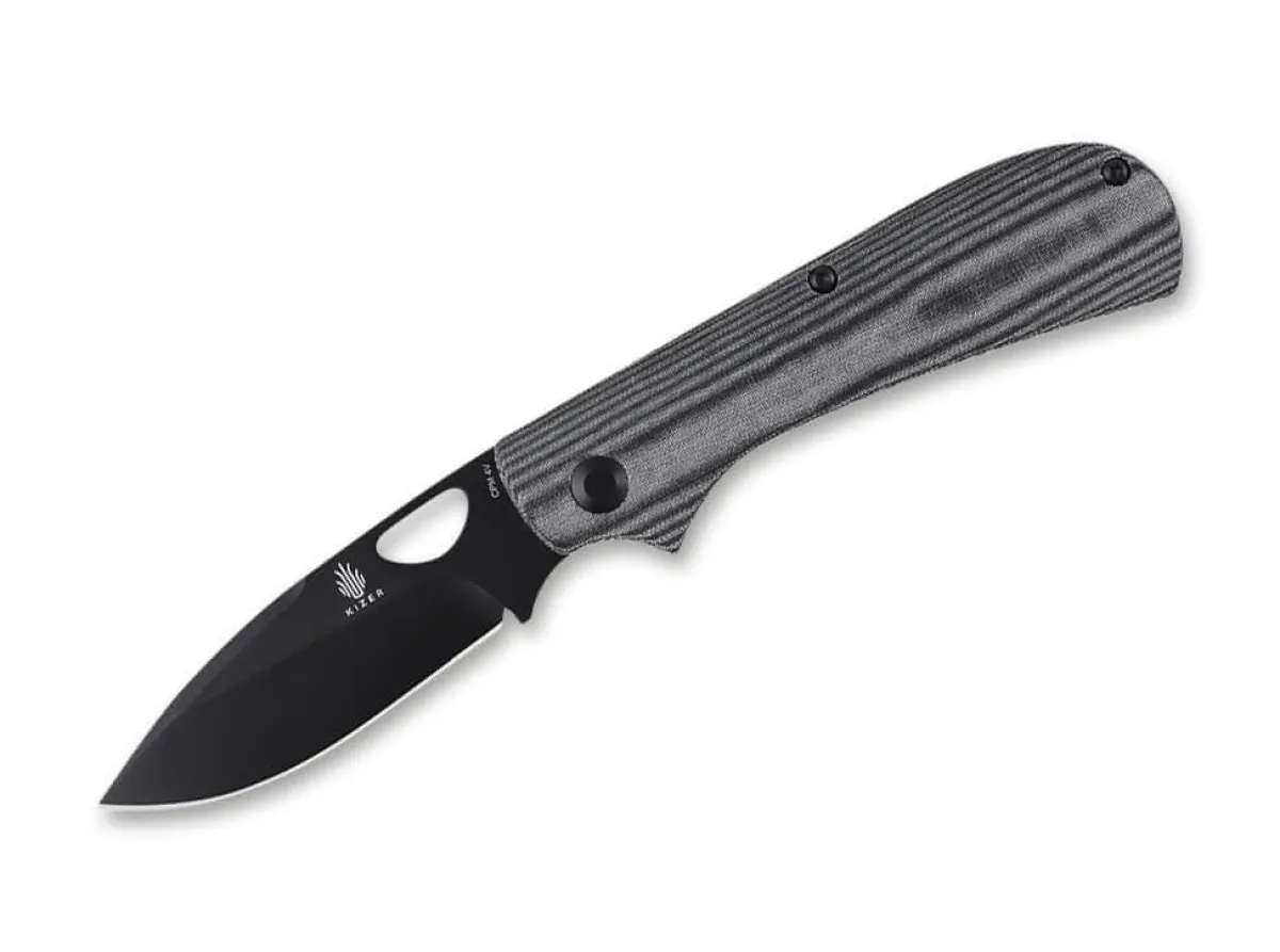 Das Kizer Zipslip Ist Ein Robustes Slipjoint-Taschenmesser Mit Daumenoffnung Und Griffschalen Aus Schwarz-Grau Gemasertem Micarta. Die Klinge Aus Pulvermetallurgischem Cpm-4Vgewahrleistet Eine Ausgezeichnete Schnitthaltigkeit. Das Besondere Kennzeichen Der Konstruktion Ist Die Ruckfeder, Die Sich Auch Beim Offnen Oder Schliesen Der Klinge Nicht Aus Dem Griffrucken Hebt, Sondern Stets Bundig Steht. Mit Clip (Tip-Up/R).