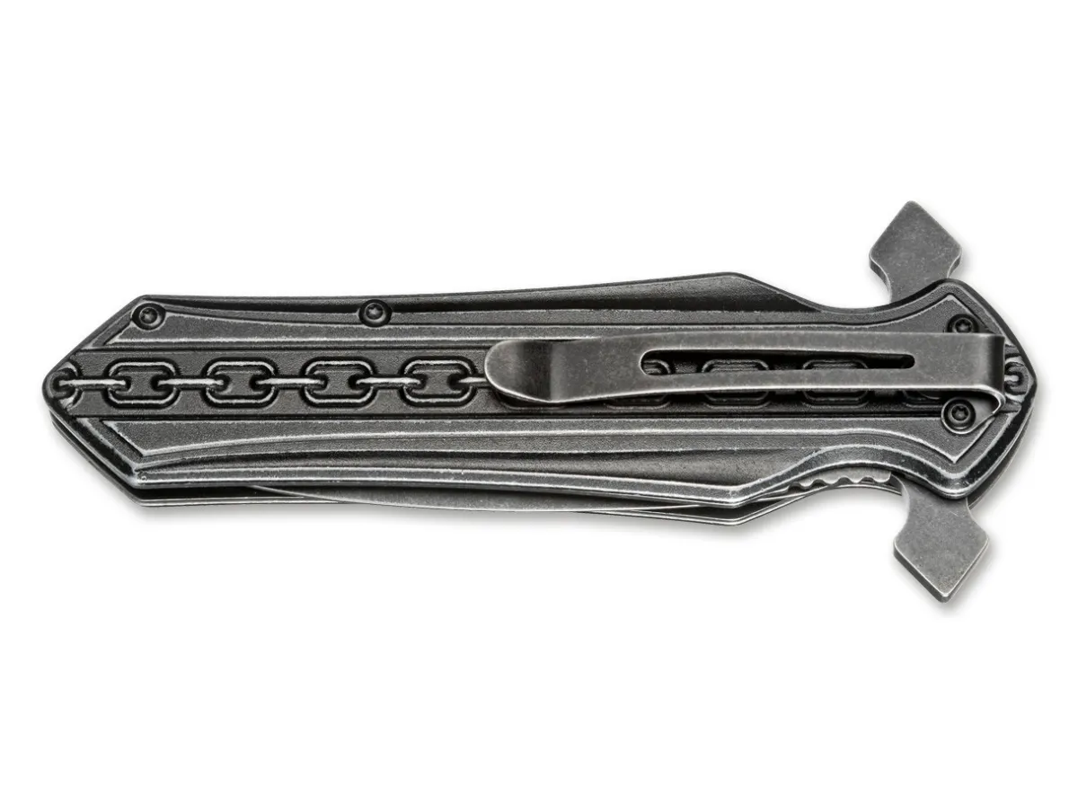 The Magnum Chain Breaker Is Anything But Ordinary. The Eponymous Chain Goes From The Point Of The Blade To The Butt Of The Handle; The Pronounced Hand Guard On Both Sides Completes The Impressive Look Of This Pocketknife. The Handle Of Lightweight Aluminum Houses The Linerlock And The Spring-Supported 440A Blade That Has A Dark Stonewash Finish. With A Clip (Tip-Down).