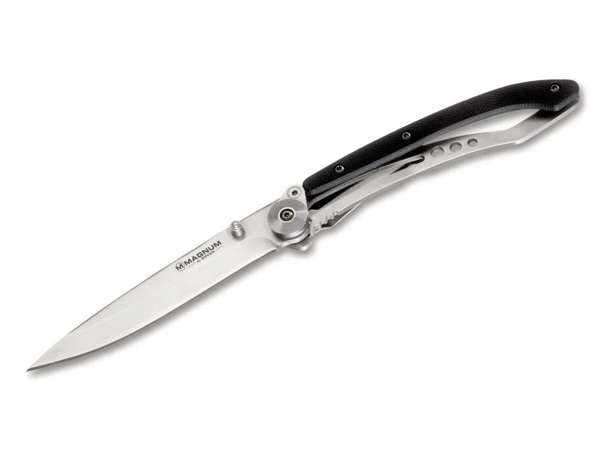 With The Magnum Dejavu, We Managed To Take The Almost 30-Year-Old Pioneering Invention Of The One-Piece Self-Supporting Framelock And Make It Even Better. In The Original Construction, The Handle And Lock Consist Of A Single V-Shaped Spring. The Handle And Blade Are Just Connected On One Side – A Relatively Weak Connection. For The Dejavu Knives A Spacer With A Screw Was Placed Right Next To The Blade Shaft. Both Hold A Small Counter-Plate. Thus The Blade Shaft Is Connected On Both Sides, Just Like A Regular Folder, Which Distributes The Load Symmetrically. This Makes The Knife Much More Stable Without Compromising The Clean And Slender Character Of This Design. Handle Scales Consist Of Black G10. The Knife Can Be Opened One-Handed.