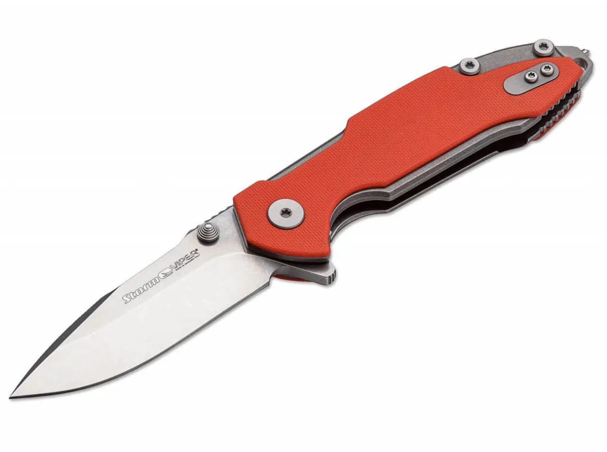 The First Cooperation Of Viper With The American Knife Maker Rick Hinderer Has Resulted In The Storm. The Many Extraordinary Details, The Outstanding Grip Position, And Its Great Practicality Clearly Portray The Style Of Rick Hinderer And His Many Years Of Experience. The Use Of Titanium And Powder Metallurgical M390 By Bohler (Rockwell Hardness 60-61 Hrc) Underlines The High Standard Which Viper And Rick Hinderer Have Put Into This Project. The Bearing-Mounted Blade Opens Per Flipper Or Thumb Button And Arrests Per Titanium Liner Lock. The Clip And The Exchangeable Back Piece (With/Without Glass Breaker) Are Also Made From Titanium. You Can Also Buy The Back Piece Separately As An Upgrade. Stonewashed Blade And Handle Scales Made Of Orange G-10. Handle End With Glass Breaker.
