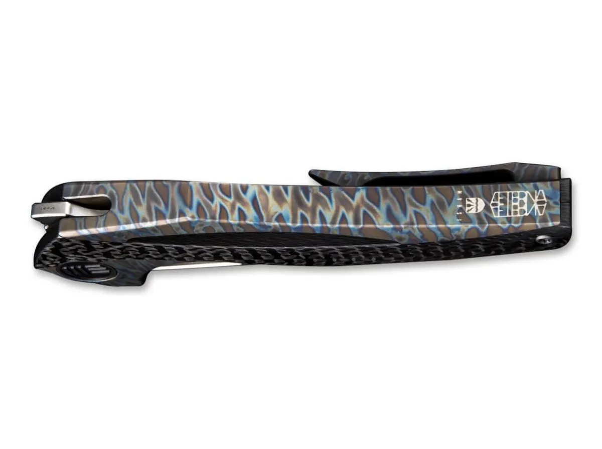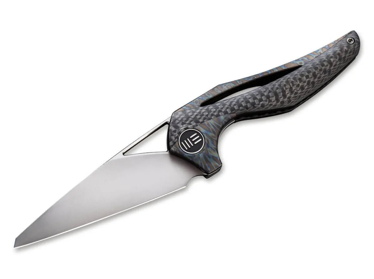 The We Knife Aeterna 918B Is An Elegant Pocket Knife Designed By Famous Knifemaker And Designer Elijah Isham. His Designs Are Often Characterized By Organic Shapes And Wavy Lines And This Holds True For This Knife. The Handle Made From One Piece Of Titanium Is Paired With Two Carbon Fiber Handle Scales Each With A Different Look. Both These High-Quality Materials Blend Beautifully, Creating An Interesting Visual Effect. The Aeterna Is Easy To Open With The Flipper, Which Is Hidden Due To The Low Set Edge. When Open, The Blade Is Held In Place By A Framelock. The Wharncliffe M390 Blade Has Elegant, Weight-Reducing Cutouts, Which Can Also Be Used As A Thumb Opening To Open The Blade. A Subtle Pocket Clip (Tip/Up) Completes The Picture.
