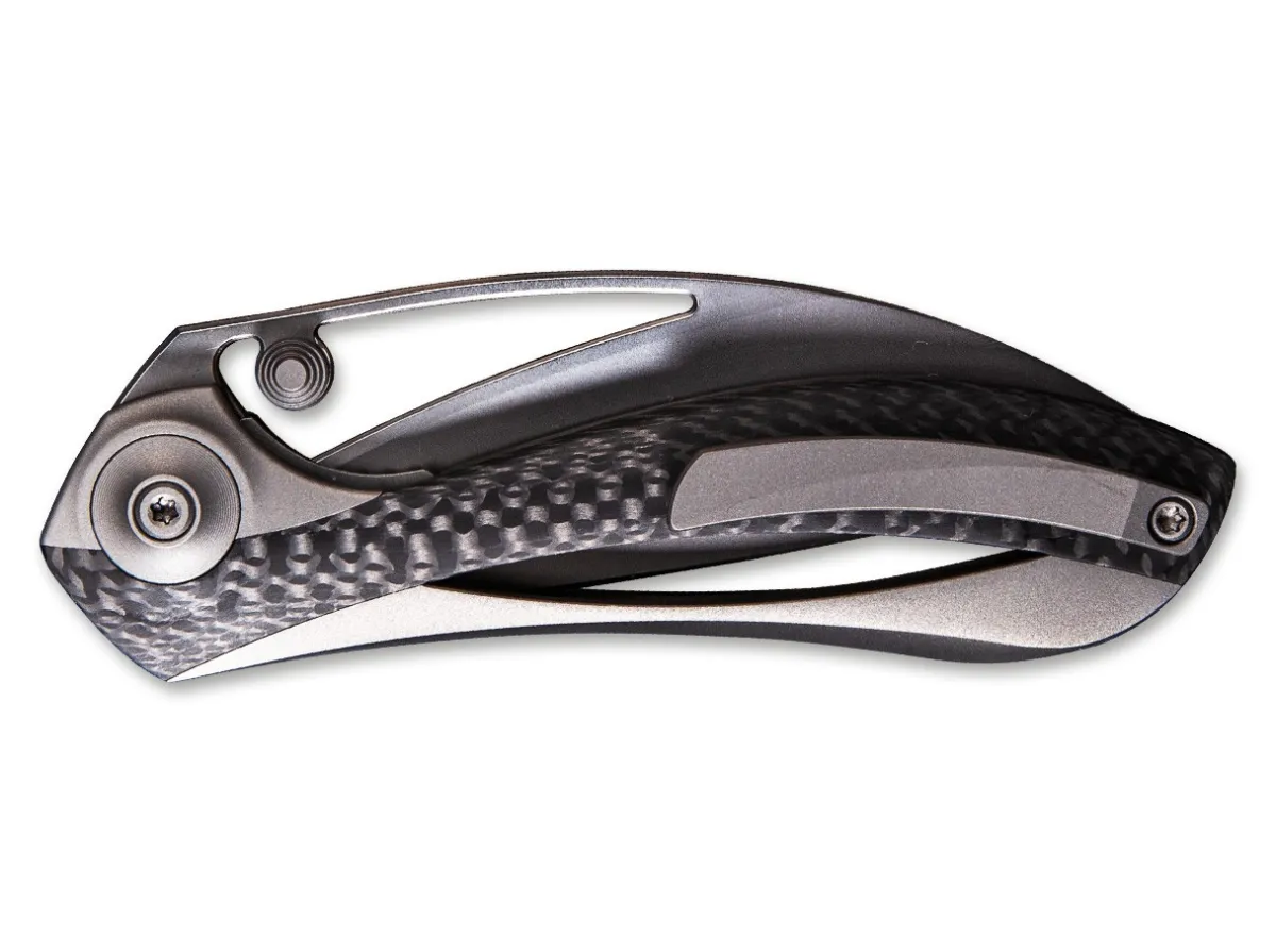 The Extravagant Design Of The We Knife Pleroma Grey Was Created By Elijah Isham. It Is Particularly Intriguing Thanks To Its Completely New Shape. The Curved Handle Consists Of Titanium And Carbon Fiber, Secured With The Inserted Stainless Steel Liner. The Blade On Ball Bearings Made From Bohler M390 Has A Free-Floating Thumbstud, Skillfully Continuing The Curve Of The Handle. The Completely New Construction Is Proof That Even Today, True Innovation In The Field Of Folders Is Still Possible. The Clip And Screws Are Titanium, Of Course.