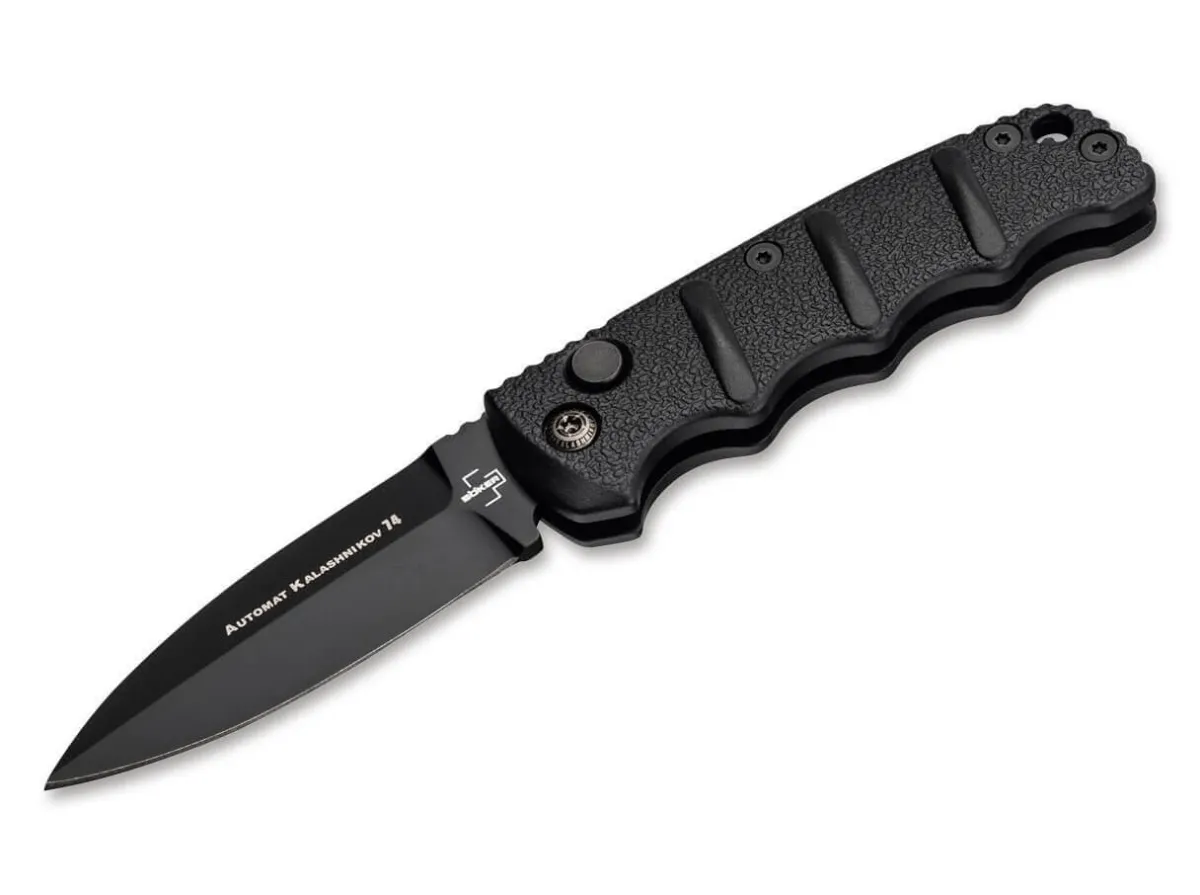 The Boker Plus Bhq Aks-74 Mini Black Dagger Is The Little Brother Of The Beloved Bhq Aks-74 Black Dagger. From Our Range, It Is Certainly One Of The Most Popular Models From The Kalashnikov Series. Boker Plus Bhq Aks-74 Models Have Been Produced In Numerous Different Variants Over The Years. Blade And Bolts Of The Exclusive Black Dagger Edition Are Covered With A Black Coating. The Black Aluminum Handle Is Strongly Reminiscent Of The Bayonet Of The Famous Assault Rifle And The Raised Textured Tracks Provide A Secure Grip In Any Situation. The Black Blade Is Made Of D2 Stainless Steel And Can Be Secured By Slide Lock In Addition To The Push Button. With Catch Strap Eyelet And Practical Deep Carry Clip (Tip-Up).