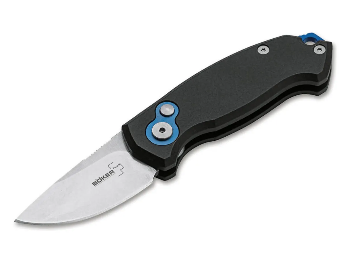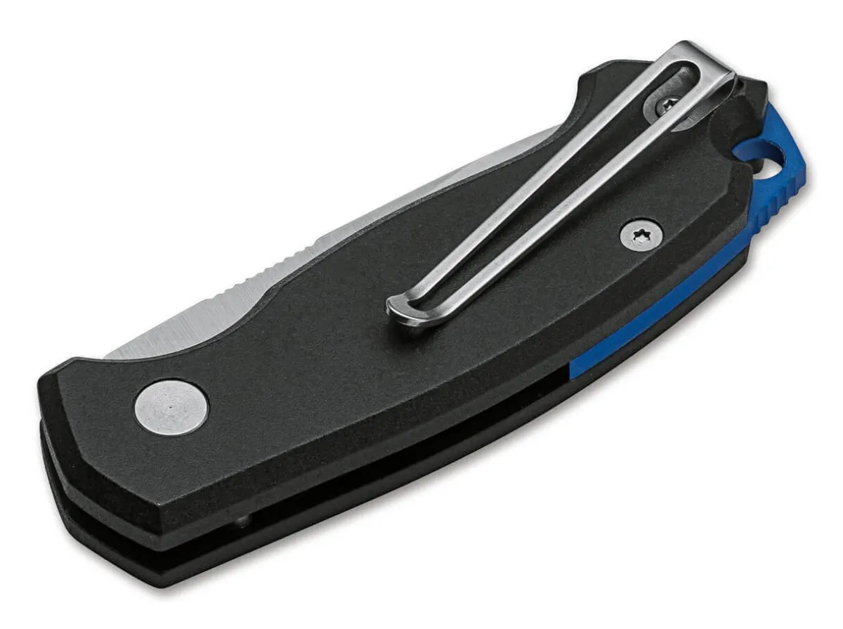 The Compact Boker Plus Kompakt By Jesper Voxnaes Offers Despite Its Small Size A Secure Grip Thanks To Its Ergonomic Aluminum Handle. The Short Aus-8 Blade Has A Light Stonewash Finish And Opens With A Push Button. The Inlay And Spacer Are Anodized In Blue, Offering An Appealing Visual Contrast. With A Lanyard Hole, A Detachable Deep-Carry Clip (Tip-Up) And A High-Quality Nylon Case For Storage.