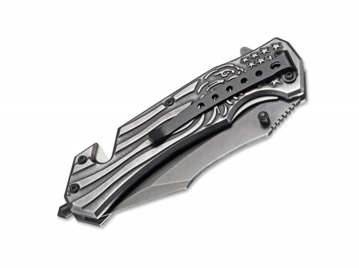 Impressive Knife That Proudly Displays The American National Symbol, The Bald Eagle, And The American Flag With Stars And Stripes. The Rugged Grip Owes Its Strength To The Use Of Stainless Steel. 440 Blade Is Either Opened With The Thumb Stud Or Flipper. Additional Features, Such As Glass Breaker, Belt Cutter And Clip, Give The Freedom Folder Its Multi-Functional Capabilities.