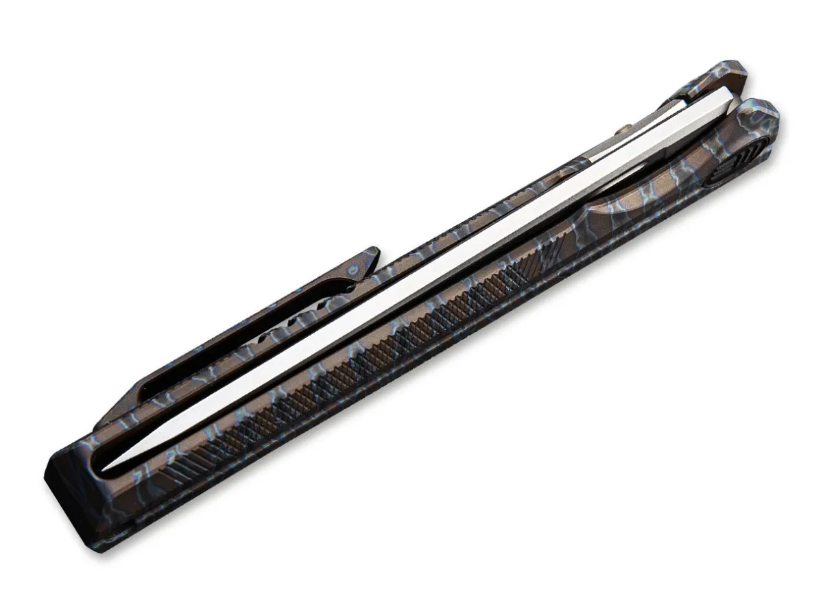 The Sophisticated Syncro By We Knife Features A Monoblock Flamed Titanium Handle, Which Is Not Constructed From Two Halves But Milled Out Of A Solid Block Of Titanium, Including The Framelock Mechanism. The Slimline Construction Is Reminiscent Of Japanese Designs. The Powder-Metallurgical Blade Of This Exceptional Knife Opens With A Flipper. The Pivot Cap, Clip (Tip-Up) And Screws Are Also Made Of Titanium.