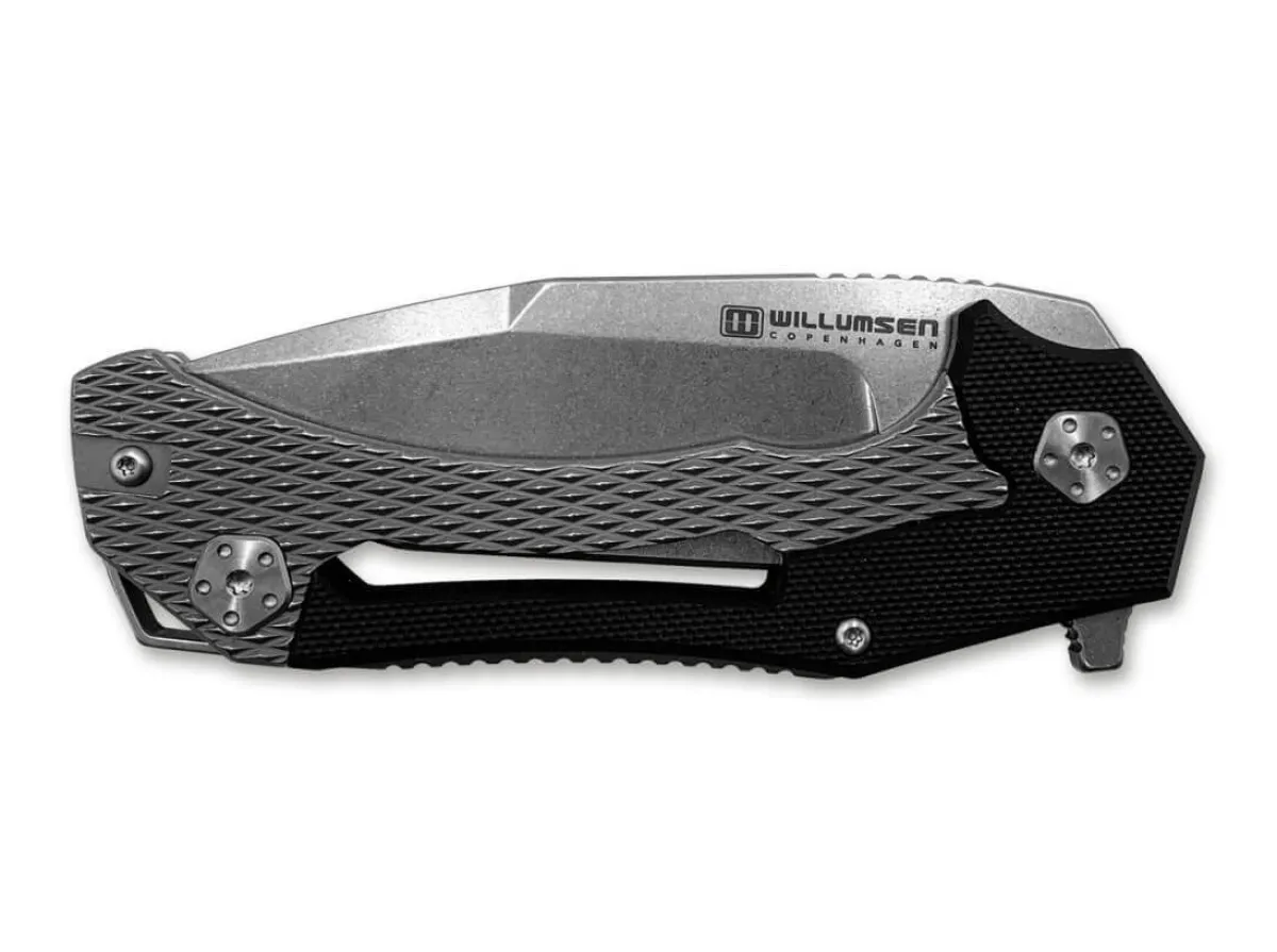 The Modern Tyran Stone Black By Willumsen Commands Respect With Its Massive 440C Blade And Non-Slip G10 And Stainless Steel Handle. The Knife Humourlessly Claims Its Dominance Over Any Cutting Work In Everyday Life With The Flipper Opening. Only The Framelock Restrains The Cutting Madness Of The Pocket Knife. With A Clip (Tip-Up /R).