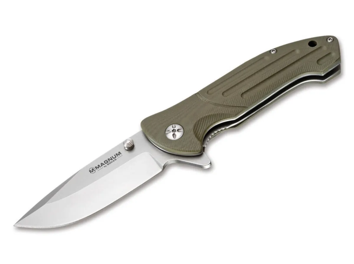 The Magnum Brutus Is A Massive Heavy-Duty Folder Offering Best Performance In Tactical And Civilian Situations. The Sturdy Blade Of Stainless Steel 440A Opens With A Flipper Or Turned Cinched Thumbstud And Is Secured With A Linerlock. The Handle Scales Of Contoured Milled G10 Offer Stability And A Secure Grip. With Its Olive G10 Scales And Blasted Blade, The Brutus Might Be Reminiscent Of A Military Context. However, The Strong Features Of This Knife Offer Considerable Advantages In Civilian Life As Well. The Wide Spade-Shaped Tip-Down Clip And A Lanyard Hole Ensure That You Won’T Lose Your Knife.