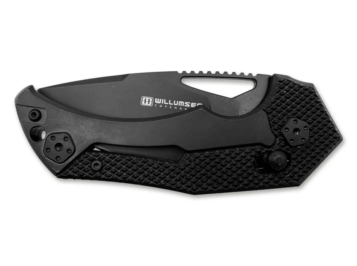 The Compact Willumsen Red E Midnight Is A Problem Solver For Everyday Cutting Tasks. Its Black D2 Blade Opens With A Thumb Hole And Locks With The Clever Axis Lock. The Non-Slip Handle Is Made Of A Material Mix Of G10 And Stainless Steel. With A Lanyard Hole And A Clip (Tip-Up / R).