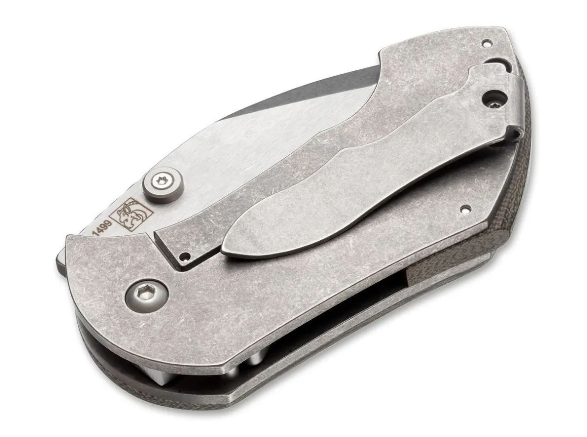 On The Front, The Solid Titanium Plates Carry A Green Canvas Micarta Scale And The Back Side Forms The Extremely Sturdy Framelock Mechanism. The Spacer In The Handle Is Equally Made Of Micarta Protrudes Like A Dorsal Fin At The Tip Of The Handle. The Beautiful Line Of The Blade Is Emphasized By The Striking Two-Tone Finishing. For This Masterpiece We Chose The High Performance Steel Cpm-S-35Vn Which Is Especially Characterized By The Alloying Constituent Of Niobium. As An Extra Feature, The Clip Reflects The Overall Outline Of The Knife. An Ultimate Knife Based On The Design Of A Legendary Knife Maker Which Will Inspire Both Collectors And Users.