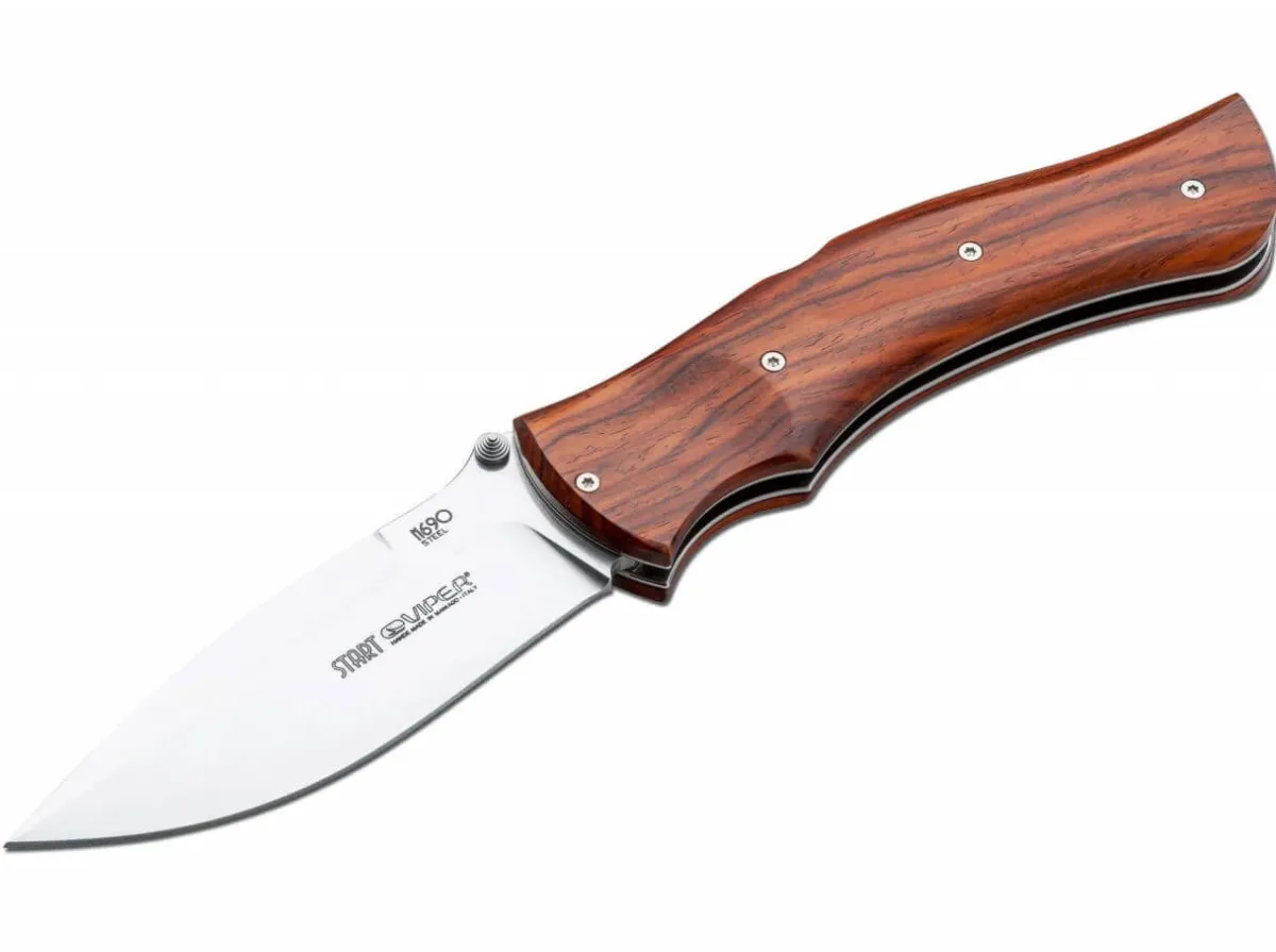 A Full-Fledged Solid Folding Knife, Which Is Equally Great In Everyday Life Or Outdoor. Despite The 10.5 Cm Long Spear Point Blade With 3.7 Mm Thickness The Knife Is Still Quite Flat And Can Be Carried Conveniently And Comfortably In A Pocket. Even Here, The Viper Own “Advanced Lockback” Is Used, An Advancement Of The Classic Back Spring Locking That Does Not Require A Lower Spring. Instead, There Are Two Permanent Wire Springs On The Left And Right Located Below The Bolsters, Which Create The Necessary Spring Pressure. In This Way Double Safety Is Ensured, For Example If In The Unlikely Event One Of The Springs Should Break, The Second Spring Would Still Provide A Locking Function. The Viper Has An Excellent Grip Due To The Ergonomically Contoured Grip Scales. Hidden Lanyard Hole. With Clip (Tip Up). Satinized Blade Made Of N690, Scales Made Of Cocobolo.