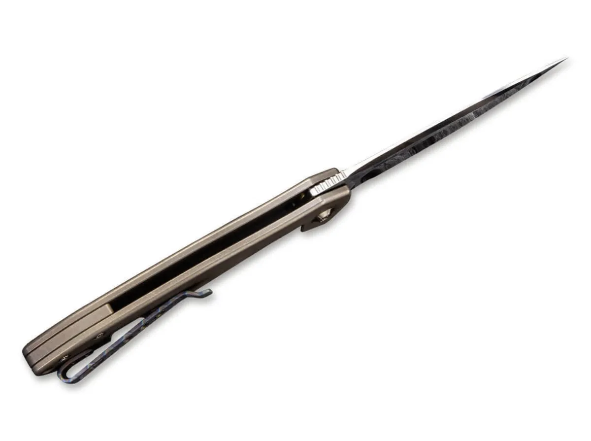 Das Wee Knife Kitefin Ist Ein Mittelgroses, Universell Einsetzbares Edc Messer Mit Einer Breiten Droppoint-Klinge Aus S35Vn, Die Eine Groszugige Fingermulde Fur Detailschnitte Beherbergt. Der Flipper Sorgt Fur Sanftes Offnen Der Kugelgelagerten Klinge Und Dient Zugleich Als Fingerschutz. Ein Solides Framelock Halt Die Klinge Fest In Ihrer Position Und Ermoglicht Somit Sicheres Arbeiten. Die Kitefin Messerserie Ist In Unterschiedlichen Grifffarben Und –Stilen Erhaltlich. Diese Version Ist Mit Formschonen Bronzefarbenen Griffschalen Aus Titan Mit Aufwendig Eingravierten Goldverzierungen Ausgestattet. Mit Fangriemenose Und Umsetzbarem Deep-Carry-Clip (Tip-Up).