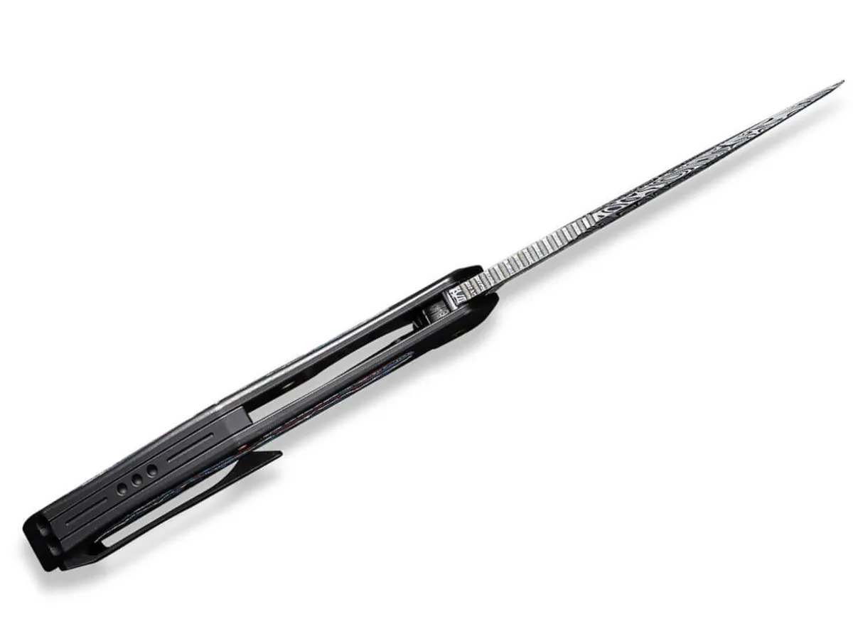 The We Knife Magnetron Exerts An Irresistible Attraction On The Knife World. The Reason For This Are The Opposites Of The Mystical Heimskringla Damascus Blade And The Black Titanium Handle, Which Is Provided With Three Openings And A Dazzling Nebula Fat Carbon Inlay. The Ball-Bearing Clippoint Blade Is Opened Silky-Smooth Via Flipper, Whereas The Frame Lock Reliably Secures The Knife. With Tip-Up Clip(R).